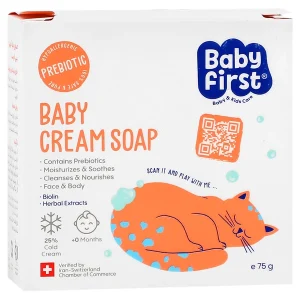 صابون بچه کرمی بیبی فرست با داشتن 15 درصد کرم مرطوب کننده، پاک کننده ای سازگار با پوست لطیف کودک است که از خشکی پوست جلوگیری می کند. این صابون با خواص ضد التهابی و التیام بخش، پوست کودک را تسکین می دهد. بهره مندی از خواص ترکیبات پری بیوتیک در این صابون، در تقویت سد دفاعی پوست اثربخش است.