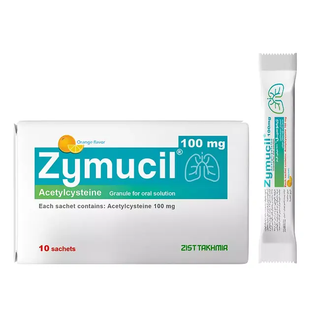 • زیموسیل (استیل سیستئین) 100 میلی گرم زیست تخمیر 10 ساشه Zymucil 100ml Zisttakhmir 10sachets، دارای 100میلی گرم استیل سیستئین در هر ساشه است. استیل سیستئین پیوند‌های دی‌سولفیدی را در موکوس باز می‌کند و ویسکوزیته ترشحات مخاطی را کاهش می‌دهد که می‌تواند منجر به رقیق شدن و خروج خلط هنگام سرفه در بیماری های تنفسی گردد. همچنین جهت درمان برونشیت نیز استفاده می شود. علائم آنفولانزا را بهبود ببخشد و به تسریع درمان این بیماری کمک می کند. استفاده از ساشه استیل سیستئین بدن را در برابر انواع ویروس ها و باکتری ها مقاوم می سازد و باعث ارتقا سلامتی می گردد.