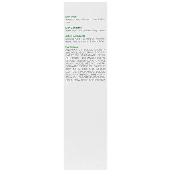 آب، سدیم لورت سولفات، گلیسرین، سدیم کاپریلویل گلوتامات، دسیل گلوکوزاید، کوکامیدو پروپیل بتائین، سدیم کوکوئیل اپل آمینو اسید، PEG-40 هیدروژنیتد کاستر اویل، سالیسیلیک اسید، عصاره برگ چای، نیاسین آمید، سدیم پی سی ای، پانتنول، فنوکسی اتانول، کلرفنزین، دی سدیم EDTA، سیتریک اسید، عطر.